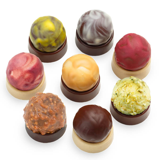 Chocolate Engineering: 8 fresh, hand-made filled chocolate balls, mounted on the finest chocolate rings for fine sensors and chocolate experts.
