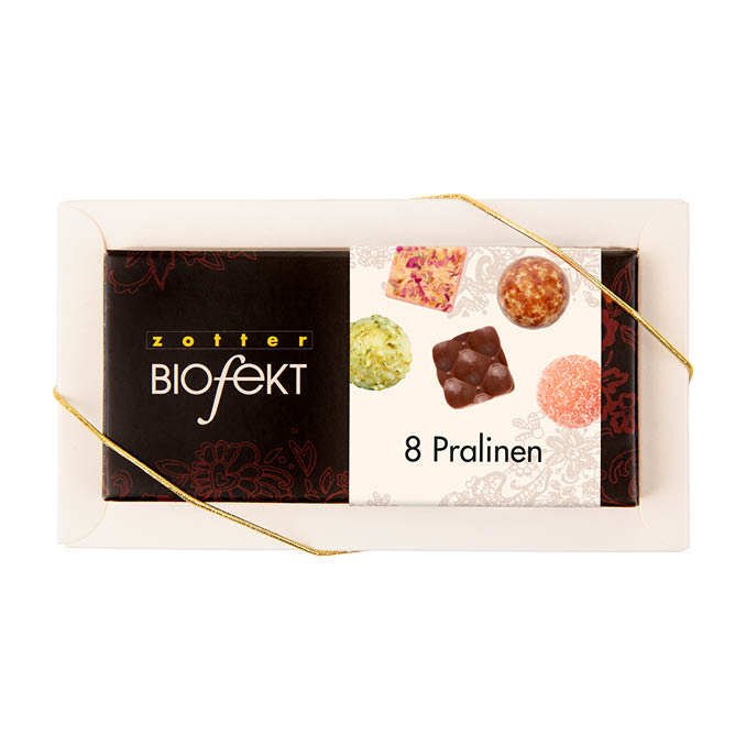 A bonbon box filled with 8 wonderfully fresh, handmade organic bonbons in the following flavours: