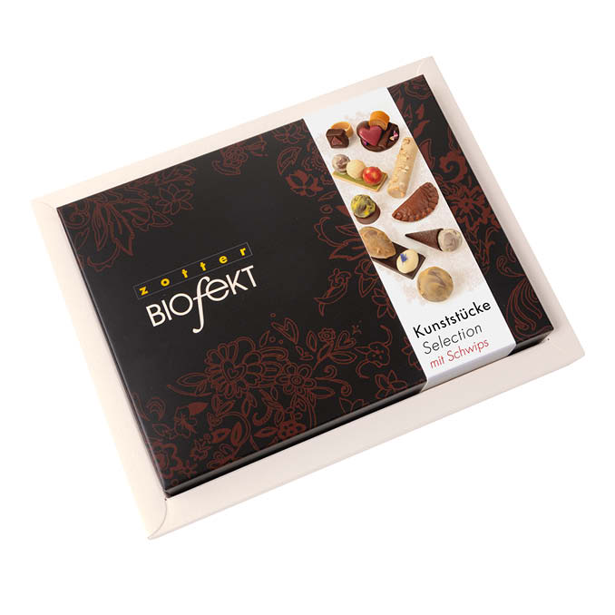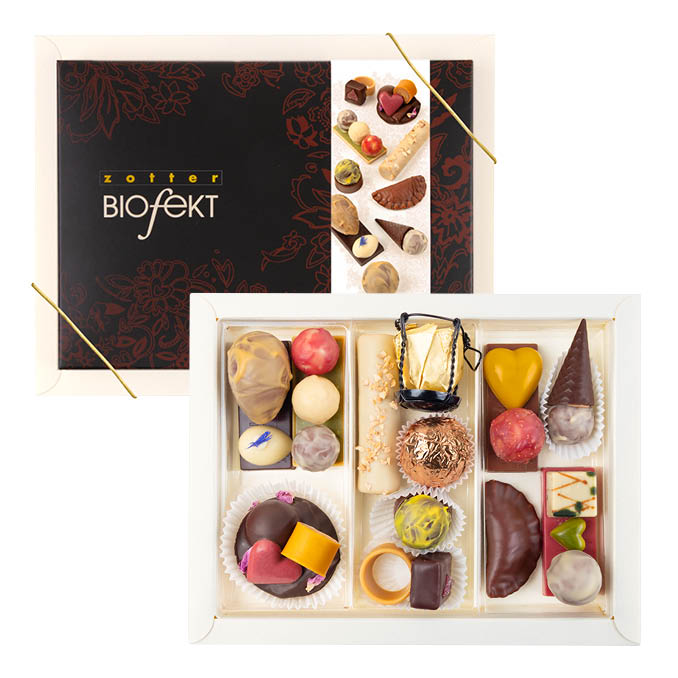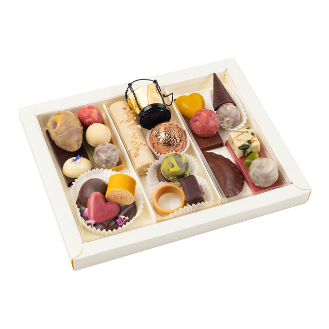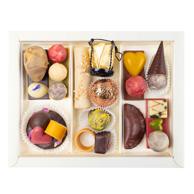 A bonbon box filled to the brim with creatively artistic, handmade organic bonbons, featuring 12 different chocolate art pieces like a champagne cork bonbon, a chocolate ring and sweet roll eggs – partly boozed up with a cheeky dash of alcohol and created with love.