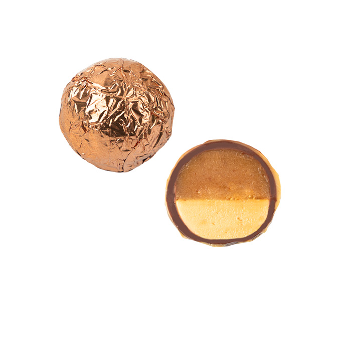 The bronze foil contains a milk chocolate ball covered with a bright yellow caramel couverture and filled with a soft, liquid butter caramel atop a tender-melting almond praline. Simply chocolatey and tender-melting, a caramelly seduction.