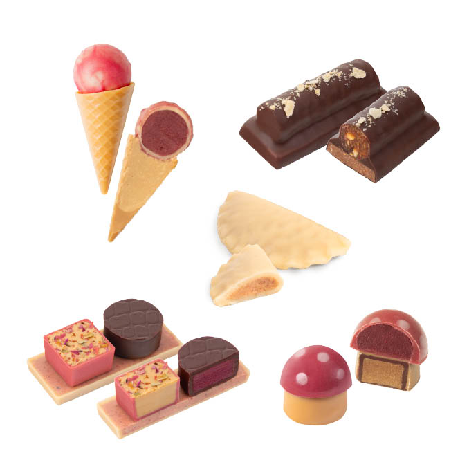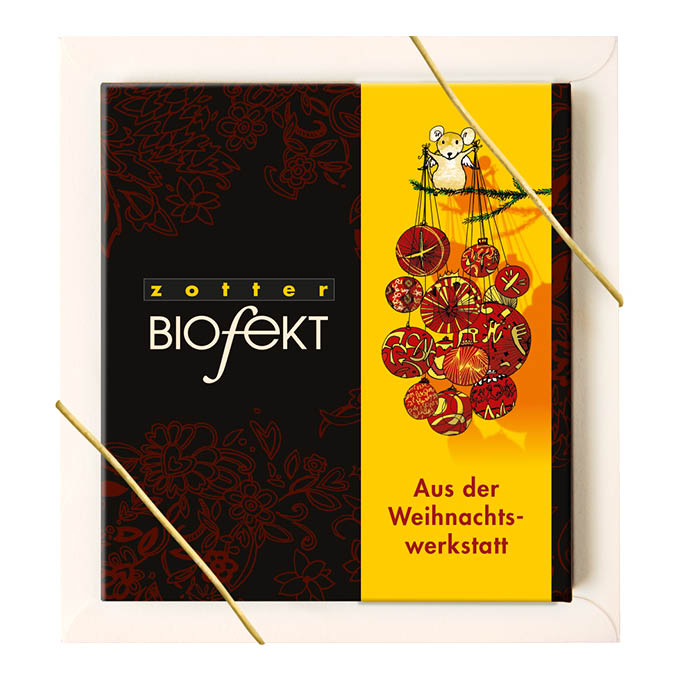 »From the Christmas workshop« there is a French White Nougat with pistachios and hazelnuts. In addition, there are 2 pure top-quality chocolates and 5 pieces of art that surprise with unusual shapes, delicate fillings, craftsmanship and a pinch of humour. Some designs feature a gold effect.
