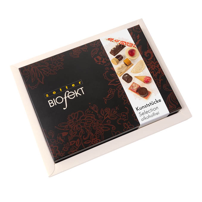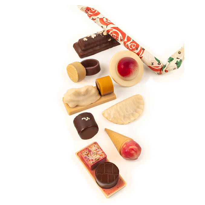 A bonbon box filled to the brim with creatively artistic, handmade organic bonbons featuring 12 different chocolate art pieces like a chocolate sushi, a chocolate ring and some sweet tapas – all alcohol-free and created with love.