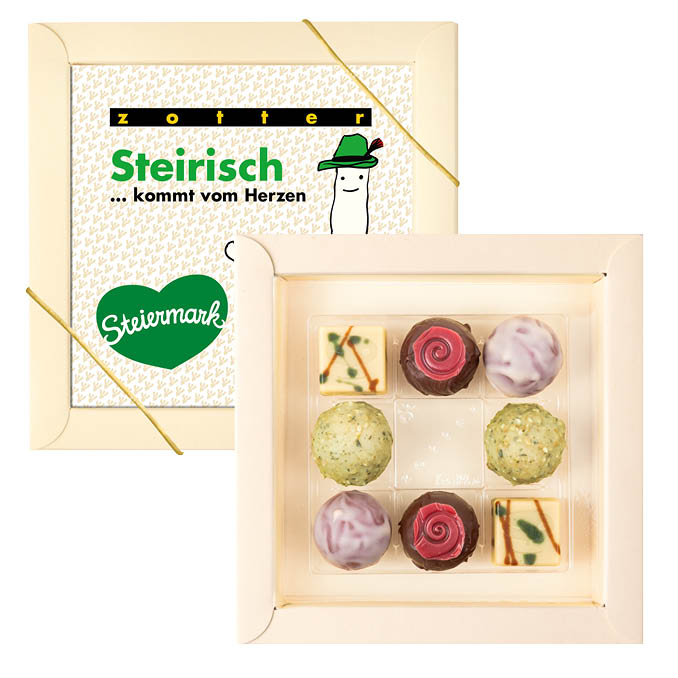 2 x Pumpkin Seed Endorphin: Green pumpkin seed praline is unique and unlikely to have been invented by anyone other than a Styrian chocolatier. Pumpkin seed oil is also in this white chocolate ball, which has been thoroughly rolled in pumpkin brittle.