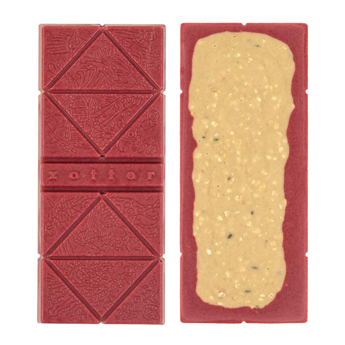 Cranberry bar° with cocoa butter° and hemp praline° with hemp seeds°