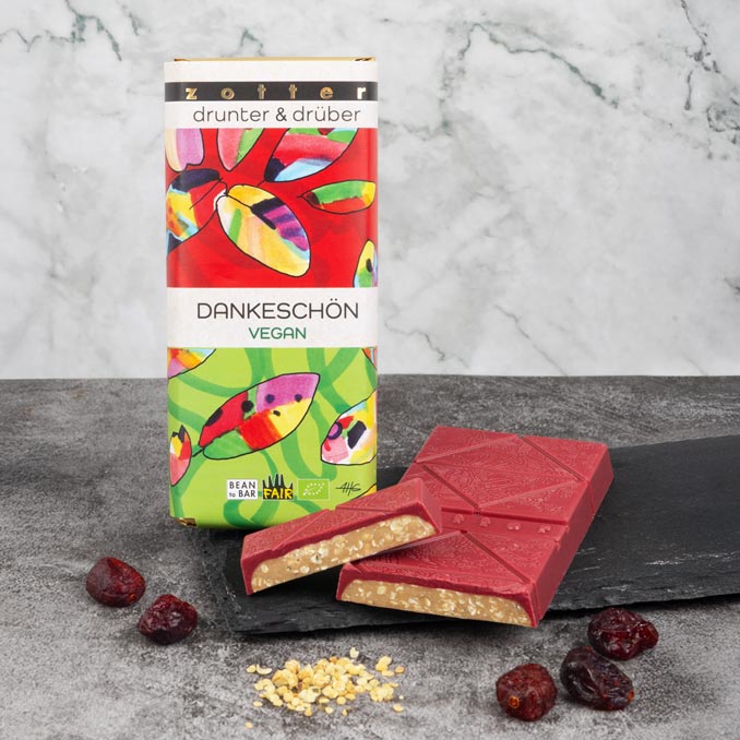 A sweet vegan thank you. On the outside, a vegan cranberry couverture in a bright pink hue, created with crimson cranberries, its stunning colour derived from the berries alone. It’s pleasantly fruity and tangy and achieves its tender melt thanks to pure cocoa butter. On the inside, a homemade hemp praline with an intense hemp aroma and infused with lots of freshly roasted hemp seeds.