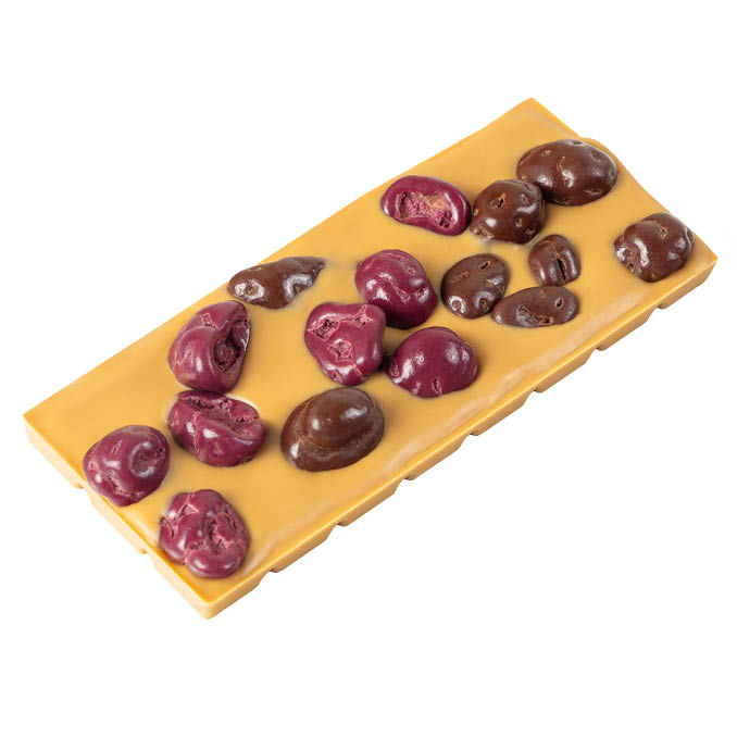 A delicious caramel couverture enhanced with caramel almond praline gets way ahead of the competition with its chocolate-covered wild mountain almonds – fair traded, gently roasted, caramelised and coated in milk chocolate. Alongside, some chocolate- covered macadamias in a fruity, purple blackcurrant shell, their stunning colour created with nothing but blackcurrants. Caramelly, crunchy, nutty with a touch of fruit.