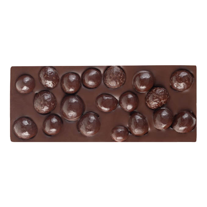 Dark chocolate with a 70% cocoa content, refined with homemade hazelnut praline and sprinkled with whole, long-roasted and caramelised hazelnuts, coated in hazelnut praline and dark chocolate. Classic, crunchy and nutty and completely vegan.