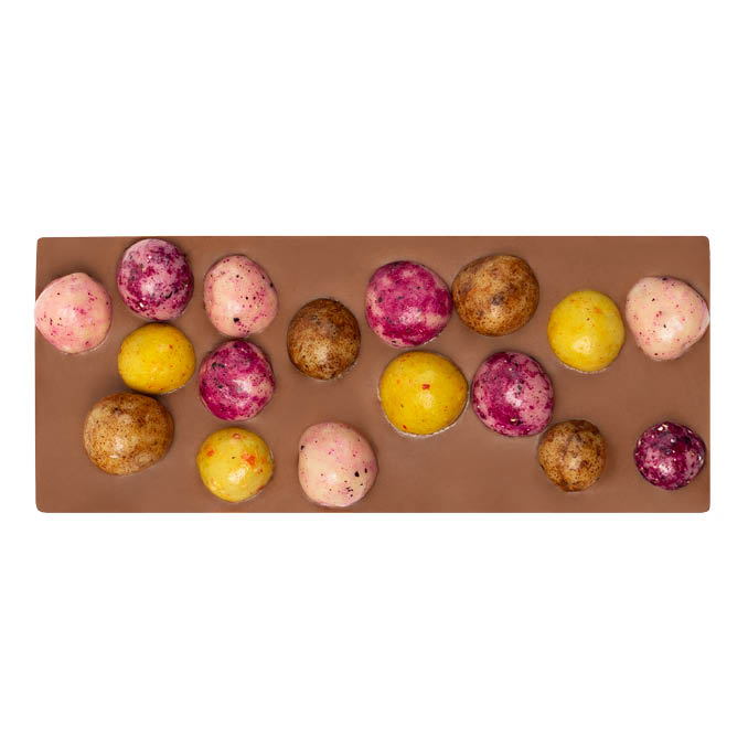 A milk chocolate elevated with the softest hazelnut praline and colourful chocolate hazelnuts in three flavours and colours. Freshly roasted, fair traded crunchy hazelnuts in a white chocolate shell, one with fabulous cinnamon, one with a purple dragon fruit coat and one in a bright turmeric yellow with fruity strawberry sprinkles. A nutty, bright and indulgent flavour-hop.