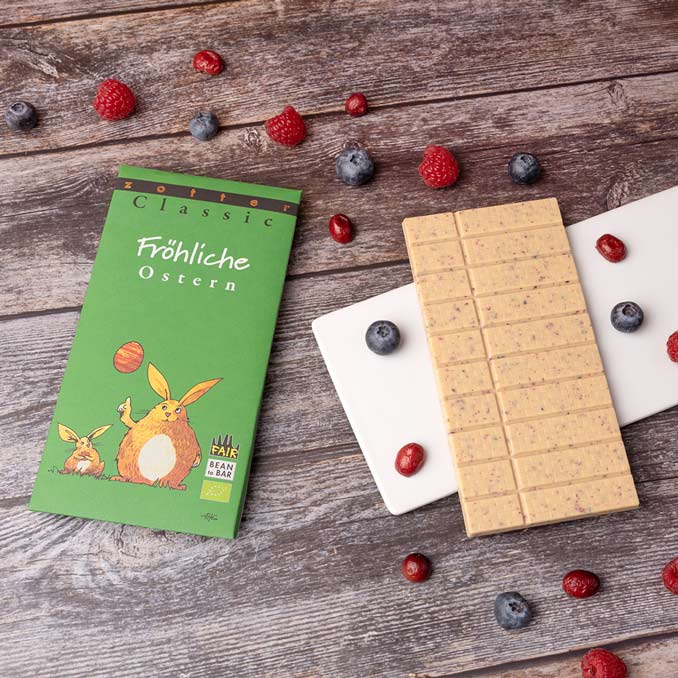 A white chocolate jazzed up with lots of raspberries, cranberries and blueberries – and elevated with some refreshing lemon couverture. We use aromatic, Tyrolean mountain milk, a high level of precious cocoa butter, raw cane sugar and genuine vanilla. It’s entirely refreshing, fruity and sweet, and has a delicious tender melt.