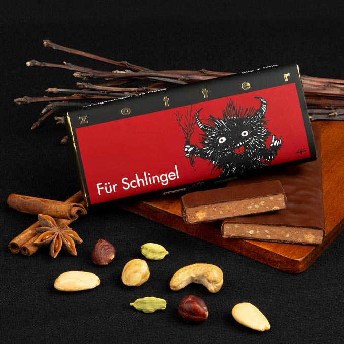 For nut aficionados: a tender-melting hazelnut praline made from many dark, roasted hazelnuts and pure cocoa butter, enhanced with roasted bits of cashew, almond and hazelnut as well as a hint of cinnamon and Bourbon vanilla. It’s coated in a delicious milk chocolate with a satisfying 60% cacao content.