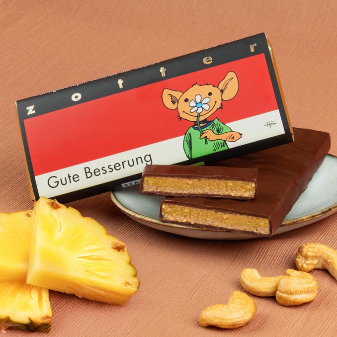 A small, sweet gift can cure all ills – prescribed entirely prescription- free. A soft, fruity pineapple layer exuding the juicy, sunny and refreshingly tangy character of this exotic fruit, sitting atop a homemade cashew praline and coated in milk chocolate with a 50% cacao content.
