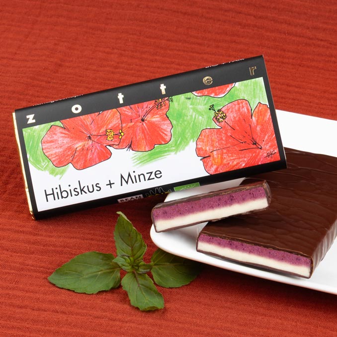 Tender-melting and simply invigorating: a refreshing white chocolate and mint layer combined with a red hibiscus layer, created by melting hibiscus powder, boiled in milk, with almond praline and white chocolate. It’s completed with a dash of lemon and a sprinkle of salt and coated in a dark chocolate with a 70% cacao content.