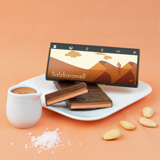 In the French manner: salted caramel is a French specialty, consisting of a candy-caramel layer elevated with a pinch of salt and a wonderful, tender-melting almond praline layer enhanced with a bit of dark chocolate and some salt crystals, coated in a wafer-thin layer of milk chocolate and all covered in a dark, fine flavour chocolate with a 70% cocoa content. The salt lifts up the caramel and tones down the sweetness – a perfect combination.