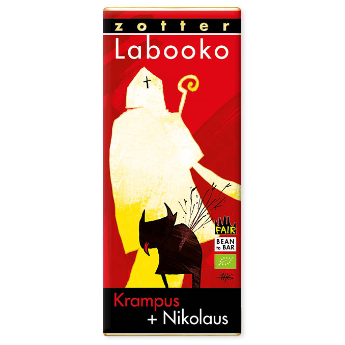 Chocolates from the bag of benevolent Saint Nicholas. 2 different bars in one package: one a fruity-red raspberry bar – its sublime colour and flavour derived from nothing but fruit. The other one a milk chocolate made from an extraordinary cacao variety, cultivated by indigenous people in the rain forests of Panama.