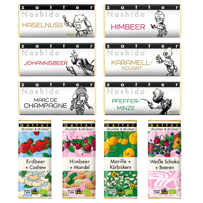 Nashidos are very thin, fine mini chocolate bars with a creamy filling. We let inspiration run its course and created seductive flavours, ranging from classic peppermint to Marc de Champagne to fruity cream varieties like raspberry or redcurrant or nutty praline flavours like hazelnut. Nashidos have a slim, sophisticated shape and melt in your mouth very quickly, making them a delicious indulgence.