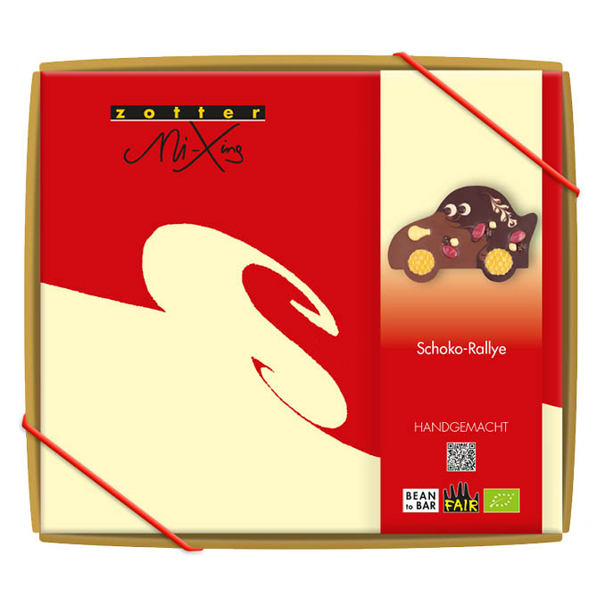 A chocolate speedster made from a dark choc and a milk chocolate with 40% cacao fuel. It’s got super cute marzipan eyes and hot apricot tires, and it’s tuned up with crunchy cacao nibs dipped in white choc and in dark chocolate, roasted pumpkin seeds in raspberry couverture, a fruity passion fruit mini light bulb and a white chocolate pattern. The speedster comes wrapped in a decorative gift box.