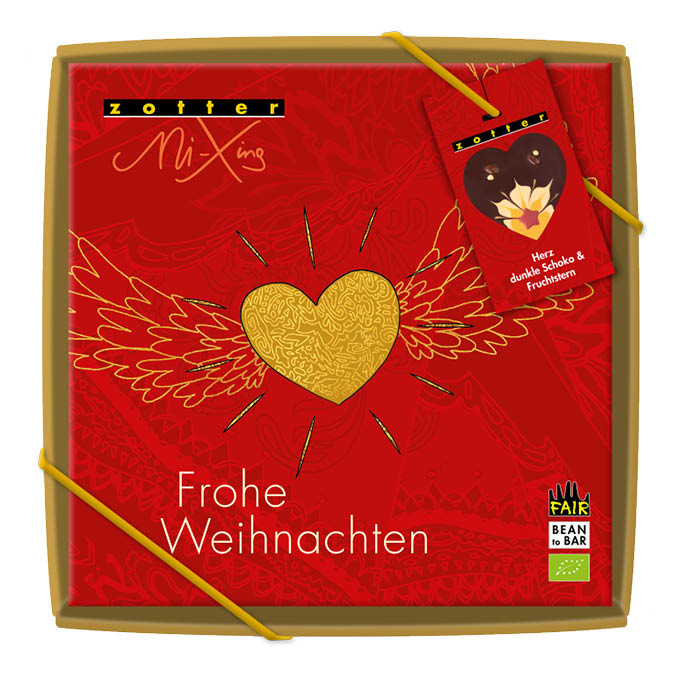 A chocolate heart made from a fine flavour, dark chocolate with a 70% cacao content, decorated with a white chocolate and apricot couverture pattern. It’s festively accessorised with a red cranberry chocolate star, accompanied by some roasted pumpkin seeds covered in milk chocolate and small, crunchy cacao nibs in a white chocolate shell. All the stunning colours are derived entirely naturally from berries and other fruit.
