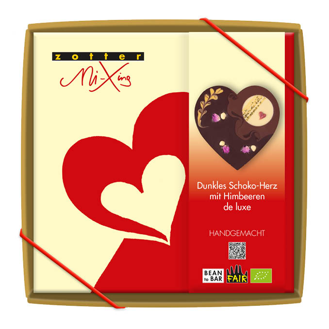 A heart made from a dark fine flavour chocolate with a 70% cacao content, filled with a fruity-red raspberry mousse and decorated with a white chocolate disc featuring a red raspberry heart, fragrant rose petals and white chocolate pearls filled with crunchy cacao nibs, alongside a fruity apricot couverture and milk chocolate pattern. All those stunning colours are derived entirely naturally from raspberries and apricots. The heart comes wrapped in a decorative gift box.
