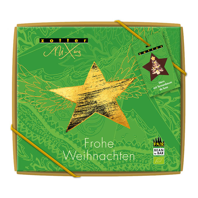A chocolate star made from a dark, fine flavour chocolate and decorated with a fir tree created with a sweet white chocolate. It features some crispy passion fruit chocolate bits and crunchy cacao nibs in a pink raspberry couverture. A delicious little caramel vanilla star crowns the tip of the tree.