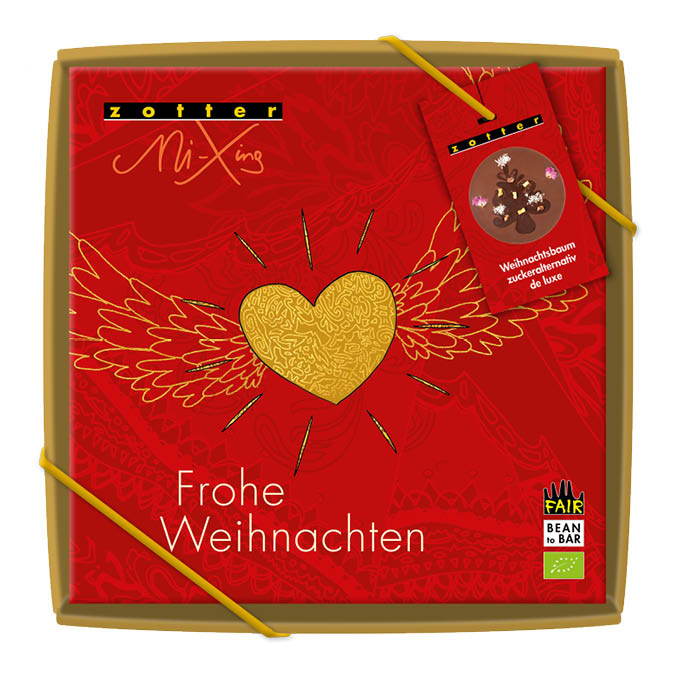 A milk choc disc with tree, sweetened with trendy date sugar. Date sugar consists purely of ground dates, which have a natural sweetness. The disc features a hand-decorated Christmas tree pattern created with 100% cacao couverture – pure cacao power without any additional sugar. The little fir tree is decorated with fragrant rose petals, bits of apple rolled in cinnamon and coconut flakes fluttering onto its branches and is wrapped in a festive gift box with a beautiful gold effect.