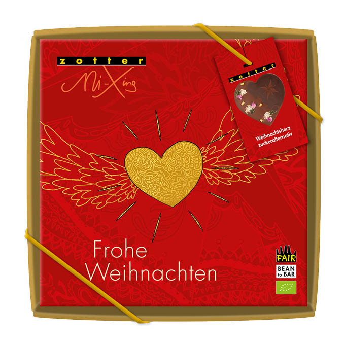 A chocolate heart made from milk chocolate sweetened with trendy date sugar. Date sugar consists purely of ground dates, which have a natural sweetness. We combine them with 100% cacao couverture and entirely do away with additional sugar, highlighting pure cacao power. The heart is decorated with fragrant rose petals, bits of apple rolled in cinnamon, roasted sesame seeds and green tea leaves and is wrapped in a festive gift box with a beautiful gold effect.