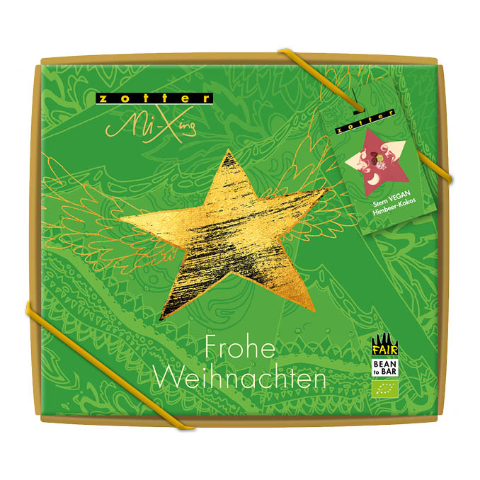 A chocolate star made from a vegan raspberry coconut couverture, its stunning colour derived entirely from raspberries alone, festively decorated with a white rice couverture pattern, a coconut chocolate moon, white coconut flakes, fruity cranberries and a crispy green tea chocolate flake.