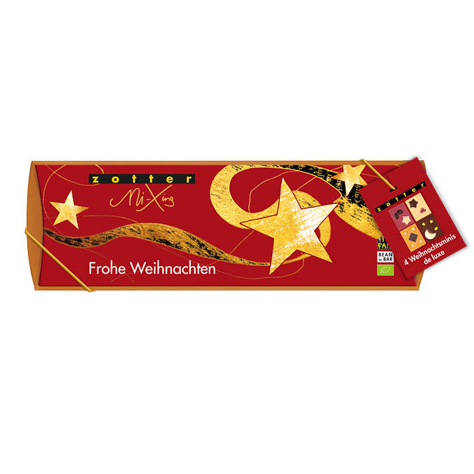 2. One small white chocolate bar, decorated with a cinnamon chocolate star and some crunchy cacao nibs covered in a fruity-red raspberry couverture.