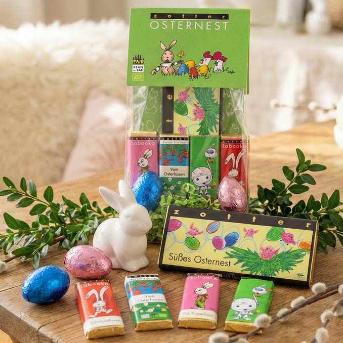 A fruity-sweet Easter nest featuring 5 Easter chocs and 2 filled choc eggs. The hand-scooped »Sweet Easter Treat« choc has a seductive pink filling made from fruit praline and super soft raspberry caramel. Alongside, there’s a small white chocolate, a milk choc, a small caramel praline bar and a little strawberry and cashew praline bar. There’s also a hazelnut praline choc egg and a choc egg double filled with strawberry mousse and praline.