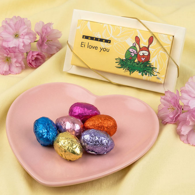 A gift set with 6 handmade, filled chocolate eggs, sent with love.