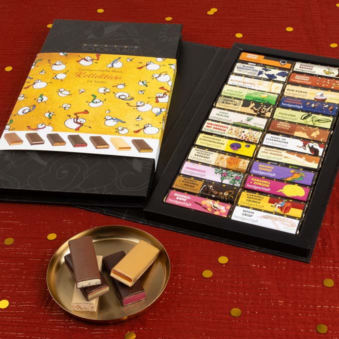 Small, hand-scooped chocolate miracles in 24 flavours, in a chic gift box with a festively decorated sleeve. A feast of indulgence with seductive aromas like raspberry, Marc de Champagne, layered praline and many more.