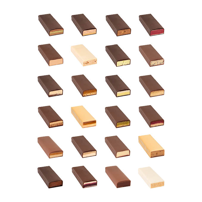 Ingredients: raw cane sugar°*, cocoa butter°*, cocoa mass°*, ALMONDS°, FULL CREAM MILK POWDER°, BUTTER°, invert sugar syrup°, MARZIPAN°(ALMONDS°, sugar°, invert sugar syrup°), MILK°, HAZELNUTS°*, SKIMMED MILK POWDER°, rice drink powder°(rice°, sunflower oil°, salt), CREAM°, hemp seeds°, caramelised MILK POWDER°(SKIMMED MILK POWDER°, sugar°), starch syrup°, PECANS°, SWEET WHEY POWDER°, HONEY CARAMEL CRISPS°(raw cane sugar°, glucose syrup°, BUTTER°, honey°, sea salt°, emulsifier: lecithin [SOY]°), maple sugar°, Cognac°, whole cane sugar°*, raspberries°, CARAMEL CRISPS°(raw cane sugar°, glucose syrup°, BUTTER°, sea salt, emulsifier: lecithin [SOY]°), pumpkin seeds°, freeze dried raspberries°, PISTACHIOS°, blueberries°, WALNUTS°, Marc de Champagne°, blue poppyseed°, sunflower oil°, CRISPY WAFFLE BRITTLE°(WHEAT FLOUR°, sugar°, BUTTER°, SKIMMED MILK POWDER°, BARLEY MALT EXTRACT POWDER°, salt), rum°*, freeze dried bananas°, coconut crisps°*, lemon juice°, ALMOND OIL°, honey°, whisky°, freeze dried lemon°(sugar°, lemon juice concentrate°, mango°, starch°), mango puree°, emulsifier: lecithin (SOY)°, apple brandy°, lemon juice concentrate°, dried mangos°, freeze dried blueberries°, coconut milk°, cornflakes°(cornflakes°, anti-caking agent: lecithin [sunflower]°), raspberry powder°, strawberries°, salt, pineapple concentrate°, EGG YOLK°, ground coffee beans°*, SKIMMED MILK YOGHURT POWDER°, lemon powder°(lemon juice concentrate°, corn starch°, sugar°), vanilla powder°*, coconut powder°(coconut paste°, coconut milk°, coconut flour°), redcurrant concentrate°, cranberry concentrate°, CASHEWS°*, cherry brandy°, freeze-dried blackcurrants°, freeze dried strawberries°, HAZELNUT OIL°, anise°, coffee powder°*, emulsifier: lecithin (sunflower)°, cinnamon°*, rose petals°, turmeric°, ginger powder°, cardamom°, star anise°, chilli ”Bird's eye”°