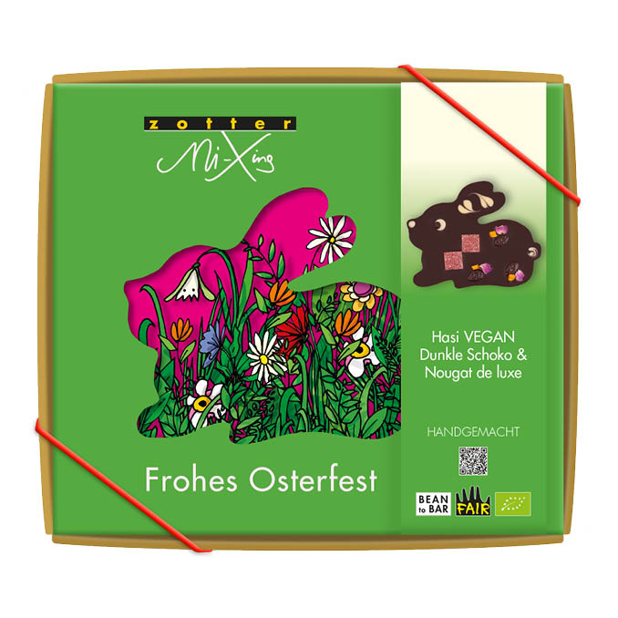Ein veganer Schokohase aus dunkler Schokolade mit 70 % Kakaoanteil, gefüllt mit knusprigem Haselnussnougat mit Krokant. Schick dekoriert mit zwei Glitzerstücken aus fruchtig-roter Himbeer-Kokos-Kuvertüre, duftenden Rosenblüten, in Zimt gerollten Apfelstückchen und gerösteten Kürbiskernen umhüllt von dunkler Schokolade. Verziert mit einem Muster aus weißer Reiskuvertüre und niedlichen Marzipanaugen. Die rote Farbe entsteht ganz natürlich aus echten Himbeeren. Verpackt in einer schönen Ostergeschenkbox.