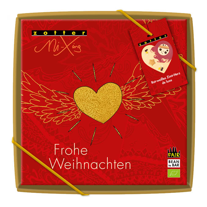 Ein weißes Schokoherz, gefüllt mit weihnachtlicher Zimtcreme. Verziert mit einem Muster aus fruchtig-roter Himbeerkuvertüre, deren schöne Farbe aus echten Beeren entsteht. Festlich geschmückt mit einem süßen Karamell-Vanille-Schokostern und einem himmlischen weißen Schokovollmond mit dunklen Schokotupfen. Dazu locken knusprige Heidelbeer- und Maracuja-Schokofrüchte neben gerösteten Sesamkörnchen.
