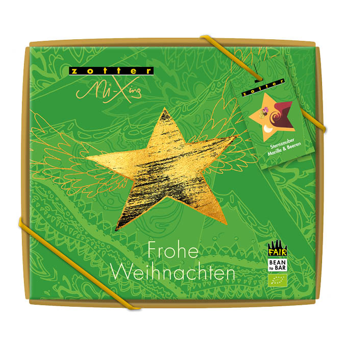 Ein bunter Schokostern aus fruchtiger Marillenkuvertüre, gemustert mit roter Himbeerkuvertüre und lila Johannisbeerkuvertüre. Festlich geschmückt mit duftenden Rosenblüten, einem Heidelbeer- Schokofrüchtchen, knusprigen Grüntee-Schokoflakes und einem weißen Kokos-Schokomond. Die schönen Farben entstehen ganz natürlich nur aus Früchten und Beeren.