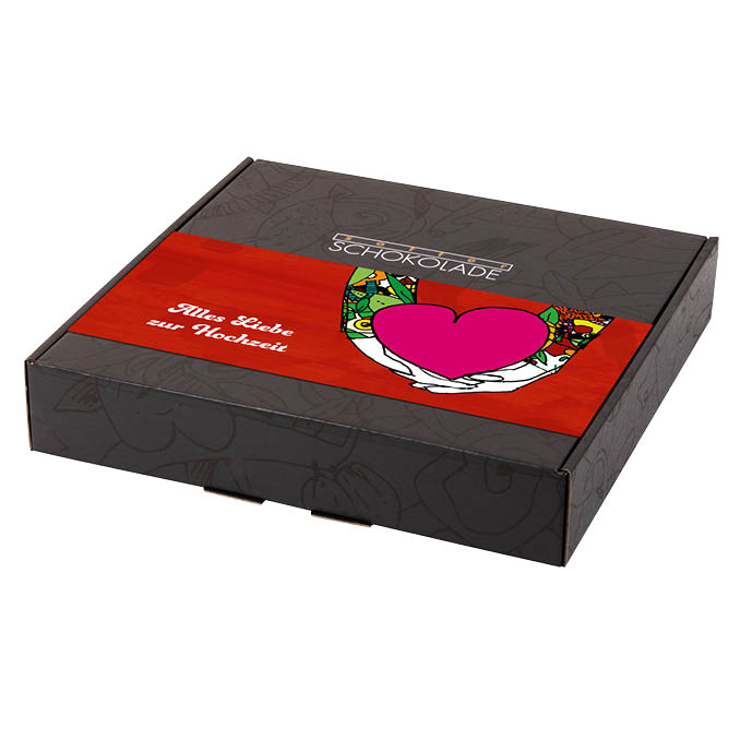 Eine süße Geschenkbox zur Hochzeit mit einer »Alles Liebe«-Schokolade, gefüllt mit beerenstarker Himbeercreme, die Ihre Glückwünsche versüßt. Dazu gibt es für das Brautpaar eine Sektkorken-Praline und eine Flower-Power-Praline, die mit einem pinken Himbeerherz geschmückt ist. Sowie eine handgeschöpfte Schokolade, gefüllt mit Weißwein-Marzipan und blumiger Holunderblüten-Minz-Schicht, dann noch »Ein Blumenstrauß« aus Nougatschokoladen, die mit Blüten und duftenden Rosen dekoriert sind und eine Trinkschokolade, die sich in einen heißen Drink verwandelt. Außerdem gibt es eine kleine, pure Milchschoko und eine große Milchschoko-Scheibe, die mit feinem Himbeergeschmack lockt. Verpackt in einer schönen Geschenkbox samt Geschenkbanderole.
