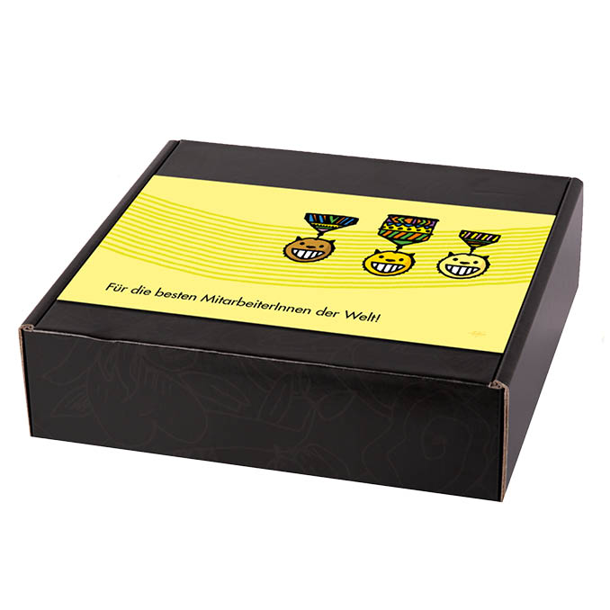 Eine Geschenkbox »Für die besten Mitarbeiter*innen der Welt!« ist ein süßes Dankeschön und pure Motivation für Mitarbeiter, die immer ihr Bestes geben. Für die Besten gibt es die gleichnamige handgeschöpfte Schokolade, die mit dreierlei Nougats gefüllt ist und eine »Dankeschön«-Schoko mit Kokos-Karamell, gesüßt mit Kokosblütenzucker. Dazu eine Labooko Spezial mit 2 exzellenten dunklen Schokoladensorten zum Vergleich und die brandneue »Pumpkin Hero«, eine weiße Schoko, die mit Kürbiskernnougat verfeinert wird und mit knackigen Kürbiskernen in bunten Schokohüllen punktet. Außerdem versüßen »Süße Früchtchen« als Feigen umhüllt von Milchschokolade den Tag. Verpackt in einer schönen Geschenkbox samt Geschenkbanderole.