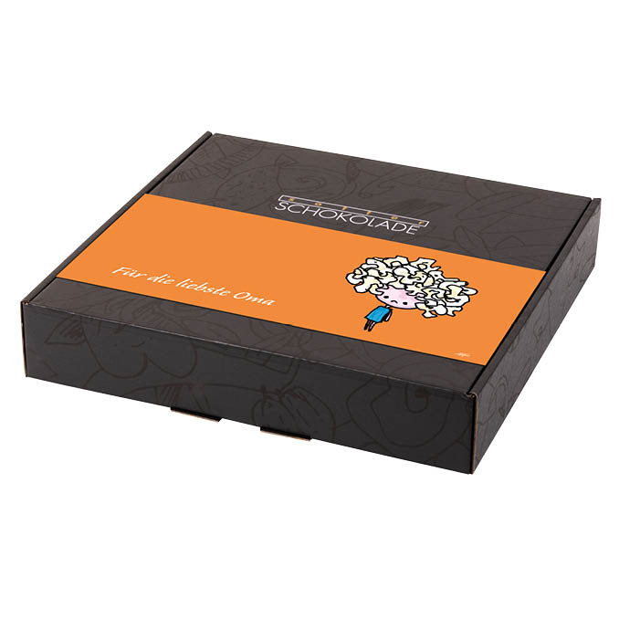 Eine süße Geschenkbox »Für die liebste Oma«, mit einem hübsch dekorierten Schokoherz aus fruchtiger Himbeer- und Johannisbeerkuvertüre, verziert mit einem Oma-Schriftzug. Dazu eine kleine, handgeschöpfte »Wie schön, dass es Dich gibt!«-Schoko mit einer Füllung aus Mandelnougat und Zitronenmarzipan, eine neue, handgeschöpfte Schokolade, gefüllt mit zart schmelzendem weißen Schokomousse und 4 große Pralinenkugeln, gefüllt mit elegantem Salzkaramell und selbst gemachtem Haselnussnougat. Außerdem gibt es noch ein »Naschkatzen«-Sackerl mit 10 verschiedenen Schokos, mit fruchtigen und beschwipsten Füllungen von Himbeer bis Marc de Champagne. Verpackt in einer schönen Geschenkbox mit Geschenkbanderole.