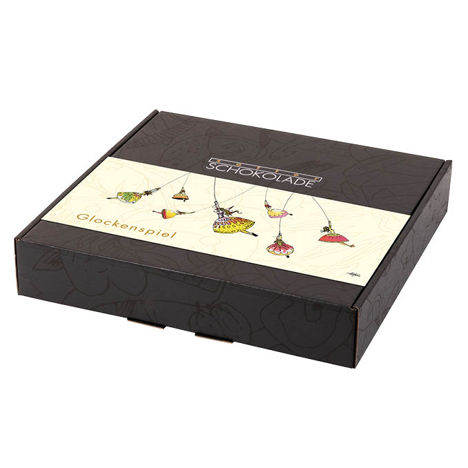 Eine festliche »Jingle Bells Rock«-Rotwein-Schokolade läutet das Fest ein. Dazu eine süße »Honig Zimt«-Trinkschokolade, eine fruchtige Lebkuchen- Schokolade, eine kleine Tafel mit cremiger Karamell-Füllung, ein süßer Christbaumanhänger mit Band und 6 handgemachte Pralinenkugeln mit festlicher Marc de Champagner-Füllung und fruchtiger Himbeerfüllung. Außerdem 2 exquisite pure Schokoladen, ein »Weihnachtstraum« aus dunkler Schokolade mit Orangen- und Maracujageschmack und eine Milchschoko mit Orangen-Karamellnougat-Füllung für »Naschengel«.
