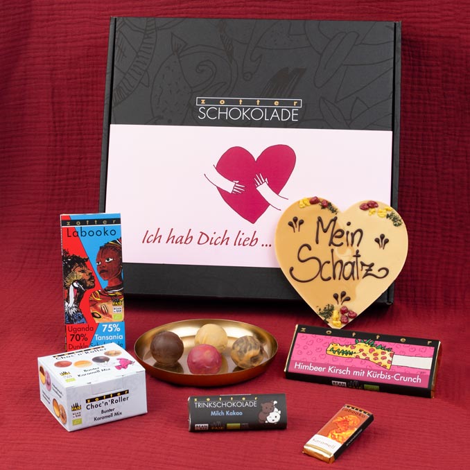 Ein Geschenkset für die Liebsten mit einem Schoko-Herz aus weißer Schokolade und fruchtiger Marillenkuvertüre, gefüllt mit beerenstarker Himbeercreme und einem »Mein Schatz«-Schokoschriftzug. Dazu eine handgeschöpfte »Himbeer Kirsch mit Kürbis-Crunch«-Schokolade mit einer dunkelroten Fruchtschicht und Kürbiskernnougat mit Waffel-Crunch, eine kleine pure Karamell-Tafel, eine Trinkschokolade, eine Labooko Spezial mit 2 exzellenten dunklen Schokoladensorten zum Vergleich und 4 große Pralinenkugeln, gefüllt mit flüssig-feinem Karamell und Nougat, mit überraschenden, innovativen Karamellsorten wie Himbeerkaramell und Marillenkaramell. Verpackt in einer schönen Geschenkbox mit Geschenkbanderole.