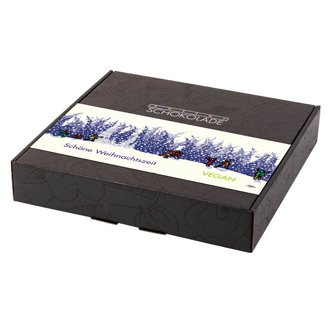 Eine Geschenkbox voller veganer Weihnachtsschokoladen