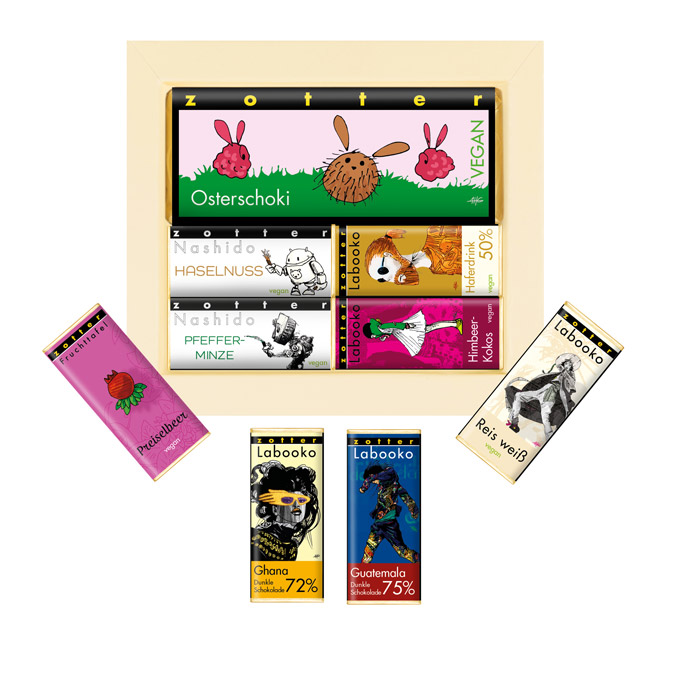 1 handgeschöpfte »Osterschoki«-Schokolade, 2 gefüllte Nashido-Tafeln und 6 pure Labooko Minis.