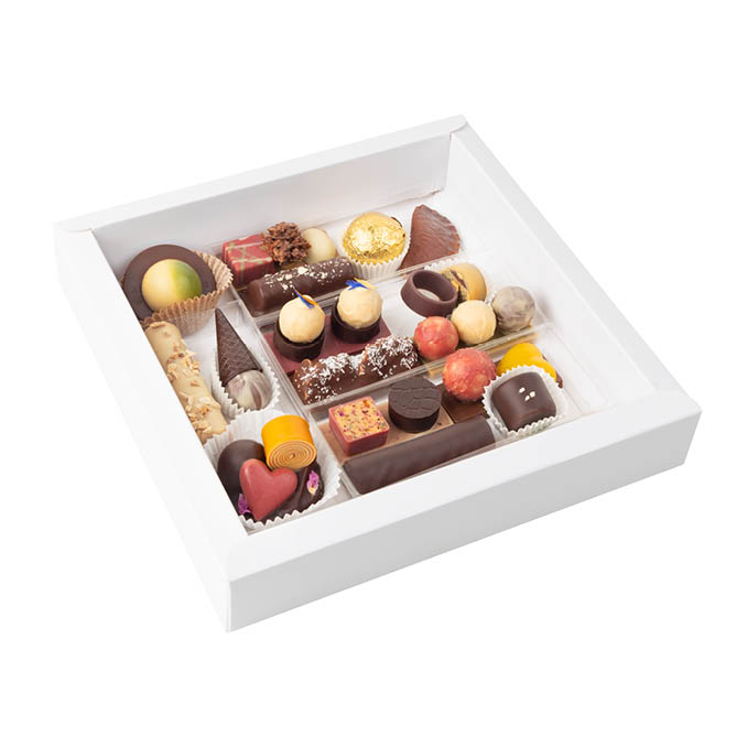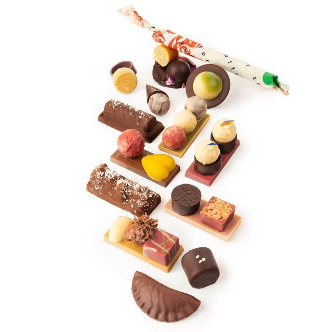 Eine große Pralinenbox voller kreativer und handgemachter Bio-Pralinen-Kunststücke. Mit 17 verschiedenen Kunststücken wie einem Apfelstrudel, Marzipanrollen bis hin zu einem süßen Schoko-Sushi – zum Teil mit einem Spritzer Alkohol berauscht und mit viel Liebe gemacht.