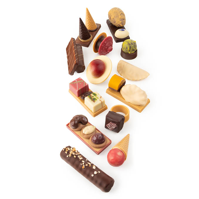 Kollektion von Pralinenkreationen (17 Stück, teilweise alkoholhaltig)