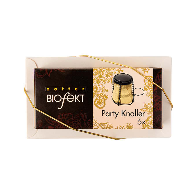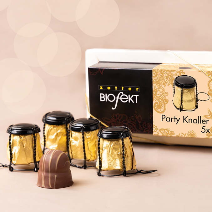 Lasst die Korken knallen: 5 Pralinen-Kunststücke, schick verpackt als Sektkorken. Schließlich gibt es tausend Gründe, um das Leben zu feiern. Die einzelnen Kunststücke bestehen aus einer Praline, die mit Marc de Champagne festlich gefüllt ist, drapiert auf einem fruchtigen Johannisbeer-Schokoring, der mit Mandelnougat und Erdbeer-, Himbeer- und Ananasfruchtstücken verfeinert wird, dazu ein Hauch Rosenöl. Überzogen mit Milchschokolade und mit bonbonsüßer Karamellkuvertüre gestreift.