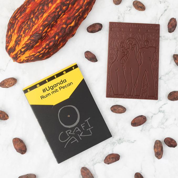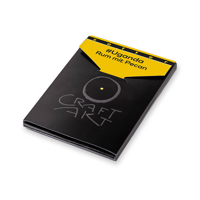 Eine dunkle Schokolade mit klasse Semuliki- Signature-Kakao von Latitude in Uganda. Nach dem Rösten haben wir die Kakaobohnen zwei Monate in Rum eingelegt. Nicht in irgendeinen Rum, sondern Ron Johan Rum von David Gölles, der in der Steiermark gebrannt wird. Nach den zwei Monaten rösten wir den Kakao noch einmal, dabei verflüchtigt sich der Alkohol, aber das Aroma des Rums bleibt! Die Schoko-Innovation mit erstklassigem Rum-Aroma, ohne dass einem der Kopf schwirrt. Verfeinert mit 30 % Pecannussnougat, den wir aus in Ahornzucker karamellisierten Pecannüssen selbst herstellen. Dabei bringt der Ahornzucker eine feine Karamellnote ins Spiel.