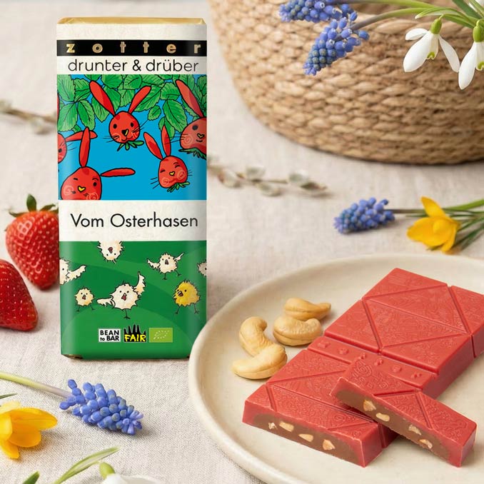 Zu Ostern spielen Erdbeeren mit Cashews Verstecken: Außen eine rosarote Erdbeerkuvertüre, die schon betörend gut nach frischen Erdbeeren riecht und deren tolle Farbe allein aus Erdbeeren entsteht. Mit einem erfrischenden Pfiff Zitrone. Innen ein zart schmelzender Nougat aus frisch gerösteten Cashewkernen, den wir Nut-to-Bar, von der Nuss bis zur Tafel, in unserer Schokofabrik herstellen. Mit vielen knackigen Cashewteilchen und reiner Kakaobutter.