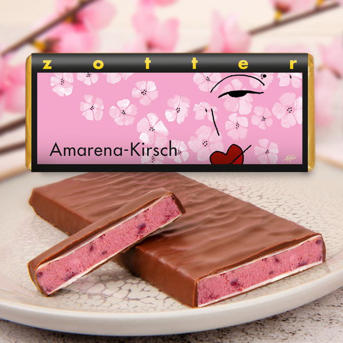 Amarena-Macarena-Stimmung: Eine fruchtige Amarenakirschfüllung, in der kleine Amarenakirschstückchen herumschwirren, die wir natürlich in unserer Manufaktur selbst angesetzt haben. Verfeinert mit Kirschkuvertüre, etwas Marzipan und echter Vanille. Zum Abschluss hauchdünn mit weißer Schokolade überzogen und eingehüllt in eine Milchschoko mit 50 % Kakaopower. Ein echter Frucht-Hit, der den Gaumen zum Tanzen bringt!