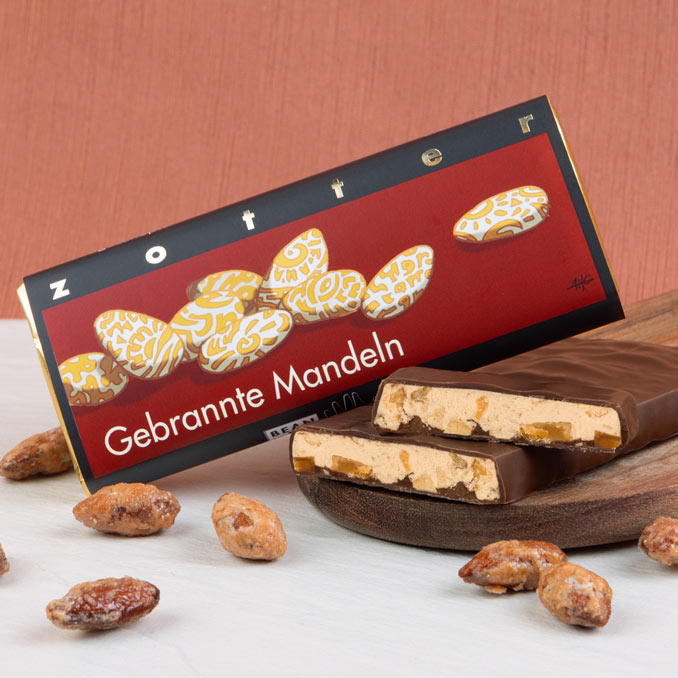 Dunkle Milchschokolade 50% gefüllt mit Mandelnougat und Mandelkrokant