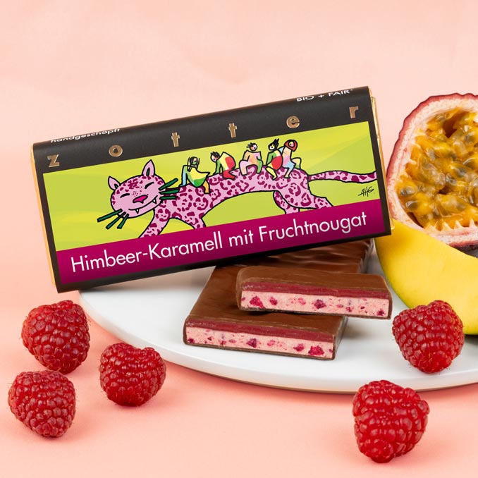 Dunkle Milchschokolade 50% gefüllt mit Himbeer-Karamell und Fruchtnougat.