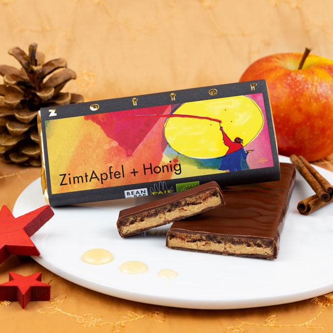Eine delikate Fruchtschicht aus in Honig-Karamell kandierten Apfelstückchen. Dazu eine Zimt-schicht aus Haselnussnougat und weißer Schokolade. Eingehüllt in Milchschokolade mit 50 % Kakaopower und feinem Schmelz. Eine fruchtig-zimtige Schokolade, die mit süßen Genussmomenten die Wintertage verzaubert.